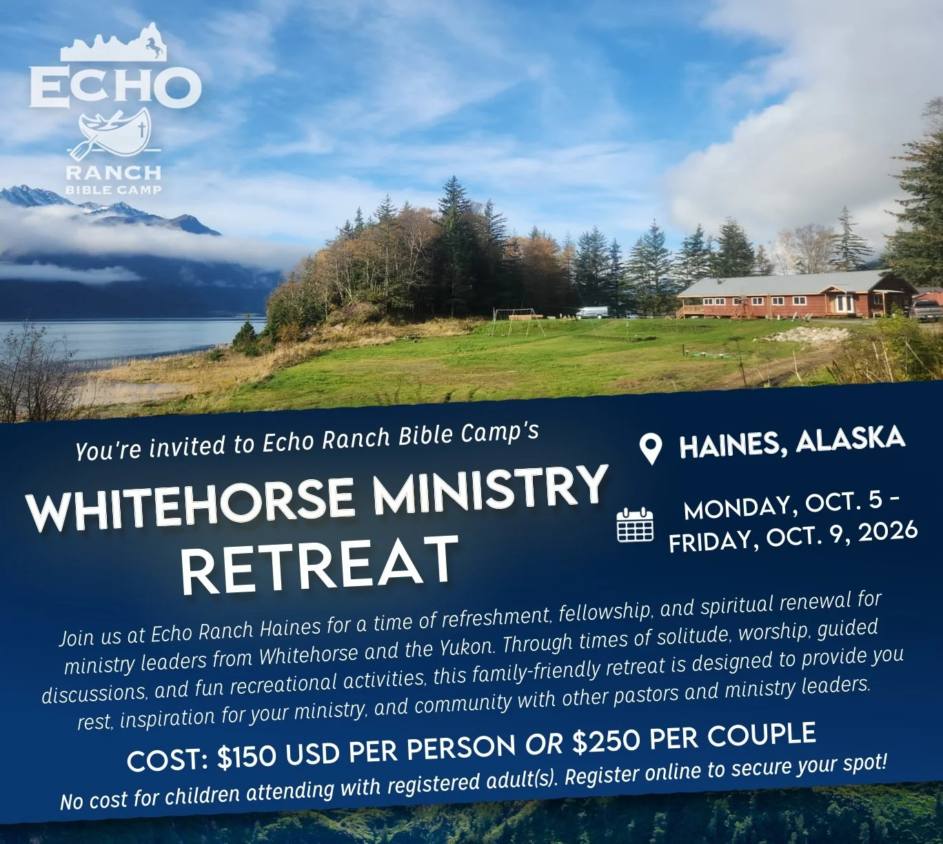 The Whitehorse Ministry Retreat is open to pastors and ministry leaders from Whitehorse and the surrounding areas to come enjoy some rest, recreation, and fellowship with others who understand the unique challenges and joys of ministry leadership. You’ll get the chance to take time for yourself to recharge and deepen your relationship with God; meet, fellowship with, encourage, and worship alongside other ministry leaders from your area and from Haines; and enjoy some fun in the Alaskan outdoors, like fishing and hiking. A guest speaker from Avant Ministries will guide us in a time of ministry-focused discussion each evening.